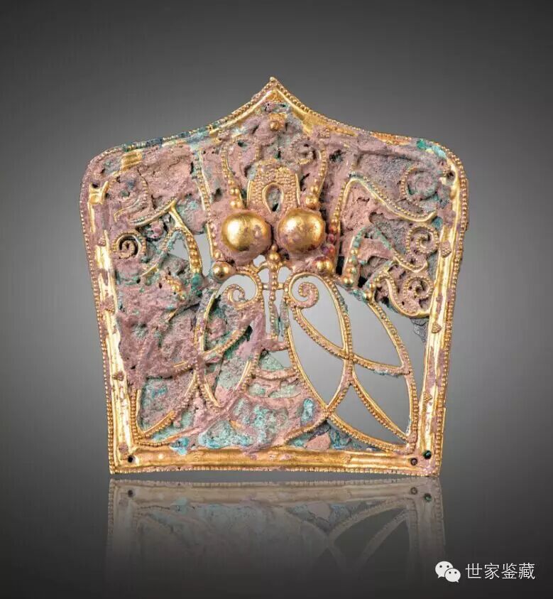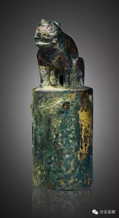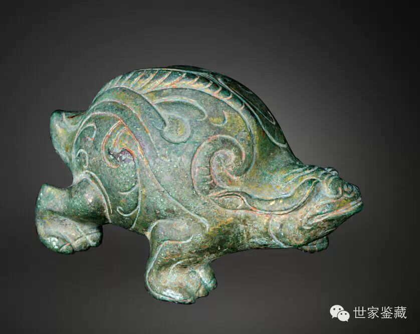 漢代為社會安定,經濟文化都迅速發展的時代,因此,在藝術方面也有極大的發展。漢朝的雕塑都具有體型比例適當、姿態生動、手法自然且富含生活氣息。此紙鎮形體圓潤飽滿,厚重敦實。形狀似龜,頭頸前伸探出,肌理感強,四肢伏地,緊抓地面,腳趾清晰可見,似在匍匐前行,背脊拱起身飾圖案,紋飾流暢潇灑。此瑞獸形態生動可愛,憨韻十足。從其青銅鎏金的質地及形式上看,可推斷爲當時皇家用器,十分珍貴難得。