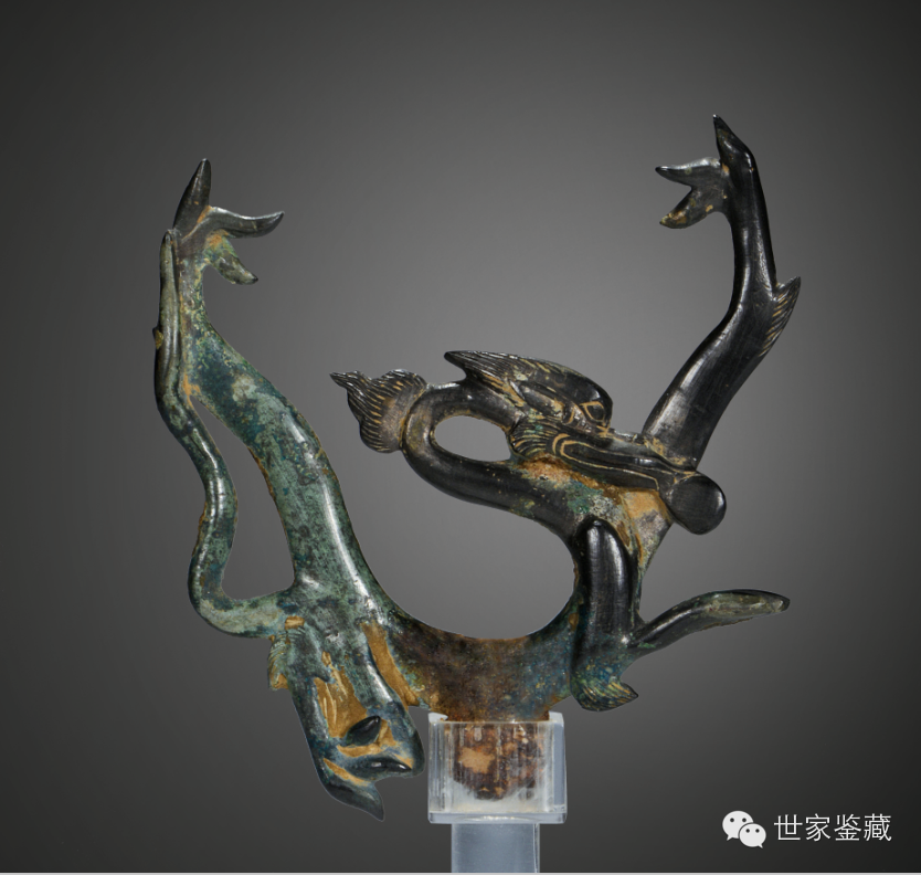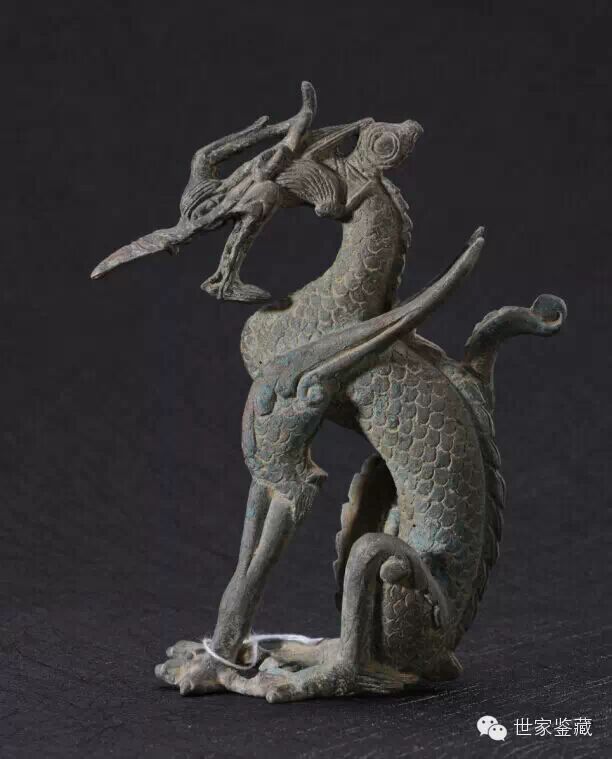 龍是華夏子孫的象征,是中華民族的圖騰,更是帝王權利的象征,歷代帝王均以龍為尊,自命為“真龍天子”。中國人亦被稱為“龍的傳人”。龍的造型多種多樣。但將幾種動物完美結合於一身的坐龍形象在中國歷代龍的姿態中極為罕見。此件銅坐龍,高:16.4cm ,唐至遼金時期,青銅材質, 造型獨特,集四種動物,即龍首、豹身、麒麟背和獅尾於一身。龍首扁長,上吻部長喙前伸,張嘴露銳利尖齒。下顎胡鬚垂下,短小精悍。仔細觀看這座銅坐龍,就會髮現它,怒目外張,龍角後捋,鬚髮翻捲,猶如騰雲而起,似乎在抒髮著一種鬥誌昂揚的心境,煞是威武霸氣。形象地體現了帝王權利唯我獨尊的氣勢。頸帶項圈,上飾火焰珠,龍身彎曲,背飾鬃毛。身披層層鱗片,鱗片疊巒分明,立體感極強,細節表現一絲不茍。背生雙翼,雙翼細長,仿佛要像我們傳達出一股神秘的信息。龍呈蹲坐式,弓起腰身,前腿直立,後腿曲踞,腿部肌肉強健,骨骼突出,落地四爪粗壯健碩,龍尾揚起捲至腰後,亦動亦靜,浩氣凜然,一種蓄勢待髮之勢躍然而出,同時還顯示出一種穩坐江山之態。後兩腿之間有孔,疑似固定器物之上所用,目前學術界多認為其為皇室的禦用車輦和禦用寶座的裝飾品。在中國歷史上的龍,或盤或飛,或走或遊,龍身若蟒,而這條坐龍為蹲坐狀,形製極為少見,全世界目前僅有八尊,均藏于世界各大博物館。這八尊銅坐龍資料在黑龍江省博物館研究員楊海鵬《金代銅坐龍發現與研究》中有詳細的論述。參閱下述資料。見,全世界目前僅見八尊,均藏於世界各大博物館。這八尊銅坐龍資料在黑龍江省博物館研究員楊海鵬《金代銅坐龍的髮現與研究》中有詳細的論述