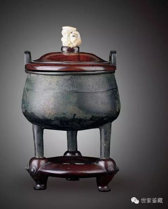 中國的青銅工藝,以商、周兩代的青銅器為代表,通常做為日常生活用品或是禮器。其形制多樣,其中的「鼎」是古代的煮食器,其造型特徵由腹、足、耳三部分組成。腹可以盛物,足可以揚火,耳可以穿杠搬運。鼎又是青銅禮器中最重要的一個品項,實用意義是盛放或烹煮食物,但價值卻體現在對禮治的維護上。一般多用於奴隸主階級的祭祀和宴飲,具有區別尊卑貴賤的功能,是奴隸主統治權力的象徵。文獻記載:「天子九鼎,諸侯七鼎,大夫五鼎,元士三鼎或一鼎」。(又有成語「一言九鼎、問鼎中原、三足鼎立」)此鼎配紅木蓋及底座,蓋上附有一白玉鈕,白玉質地細膩油潤,色澤白晰,且帶有原始紅色皮籽,巧雕而成。鼎口上立雙圓鼎耳,折沿方唇,腹略深,圜底,三柱足,柱足略外撇,腹壁上飾有一凸弦紋。此鼎厚實穩重,銅質精良,器身古樸素雅,別具韻味。上刻銘文“作父”寶用。