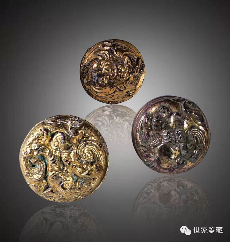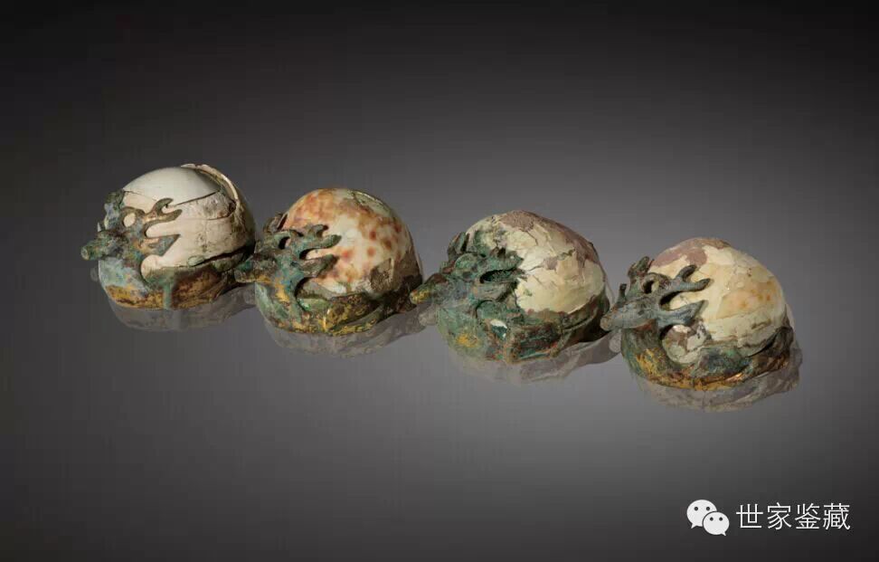 席鎮是系壓帷帳或席角之物,其曆史源遠流長。魏晉以前古人席地而坐,即坐在鋪設於地面的草席之上。王室貴胄之家,備有低矮的床榻,上面也要鋪席。有的床上置帷帳,帷帳四角也常用鎮來壓住。不僅如此,席鎮還有辟邪的功能。早在春秋戰國時就有實物遺存,如浙江紹興印山大墓出土的春秋玉鎮就有19件之多。這組席鎮爲鹿的造型,通體鎏金,呈半臥狀,昂首,鹿角粗壯,背部圓形,上嵌貝殼,底部平整。爲增加鎮的重量,在貝殼內灌沙。瑩潤的貝殼和銅鑄的鎮體搭配得和諧自然,實用性和裝飾性被巧妙地統一起來。鹿形整體製作手法寫意,線條刻畫簡潔明快,且象征高官厚錄,寓意吉祥。此席鎮的工藝繁複,鎏金及嵌貝殼工藝高超,檔次極高,當爲王侯之家所用之物。曆經兩千余年,保存至今的成組席鎮,實屬罕見,因此堪稱國寶。