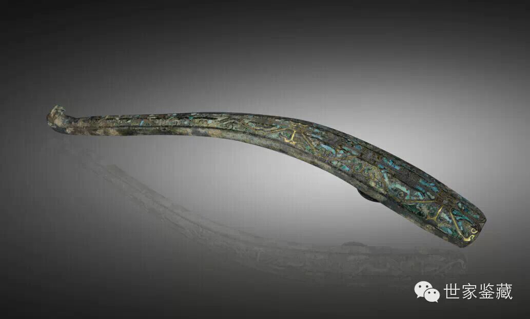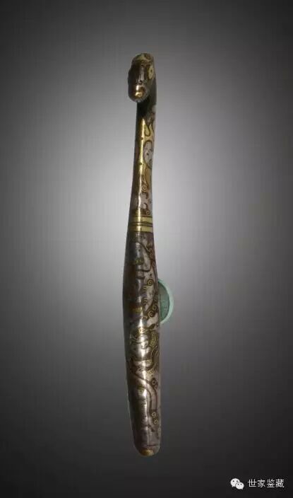 帶鉤,為束在腰間皮帶上的鉤,多用青銅製,也有鐵製、金製和玉製。帶鉤原為「胡服」所用,春秋、戰國時我國各族間交往頻繁,由鮮卑族傳入中原,其制一端曲首、背有圓鈕。形式多樣,常見的有棒形、竹節形、琴面形、圓形和獸形小帶鉤。有的華美的帶鉤鑲玉、鎏金、嵌綠松石或加金銀錯,個別的有文字。盛行於戰國至漢代,魏晉時仍沿用。