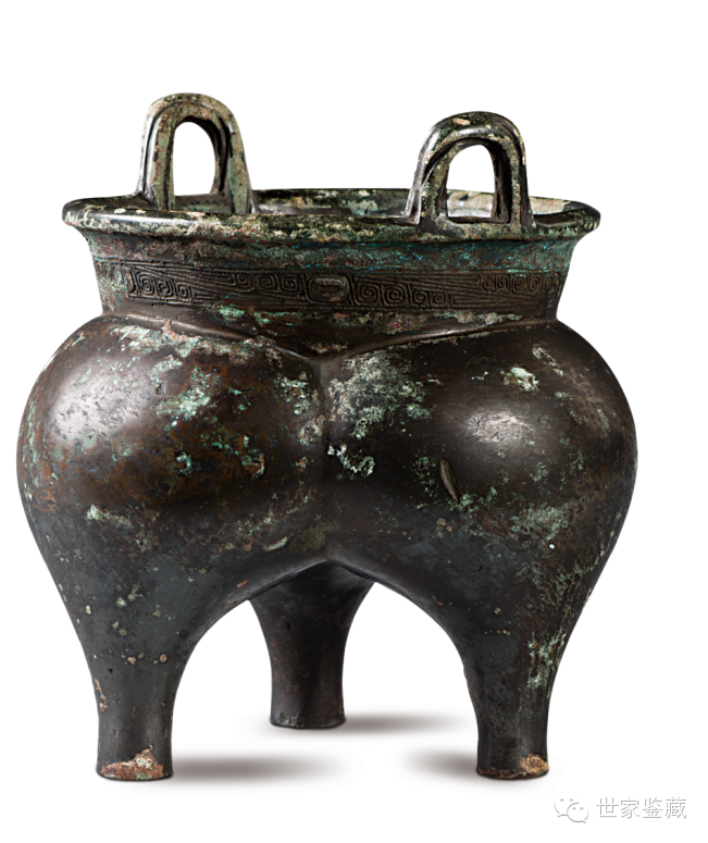 鬲爲古代煮飯用的炊器。銅鬲最初是依照新石器時代已有的陶鬲制成的。其形狀一般爲侈口(口沿外傾),三袋足,便于炊煮加熱。銅鬲流行于商代至春秋時期。商代前期的鬲多無耳,後期口沿上一般兩個直耳。此鬲,采用青銅精制而成,侈口,上立雙耳,束頸,頸部飾一圈竊曲紋,腹部呈三肥大袋足,矮裆,柱足,腹部無紋。此鬲型制規整,綫條流暢,打磨光滑,色澤黑亮,鏽色自然,紋飾簡練切不失精美,能如此完完整的保存至今,實屬難得,待有緣人收而藏之。