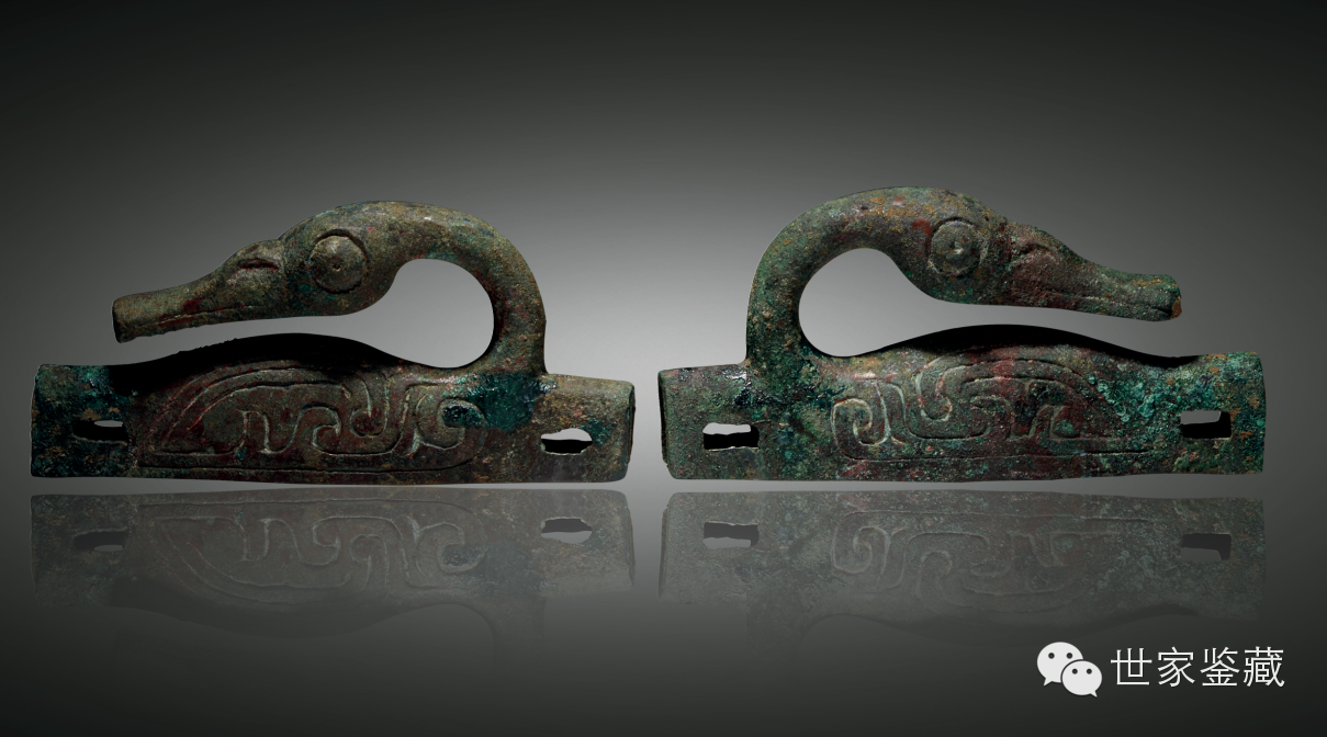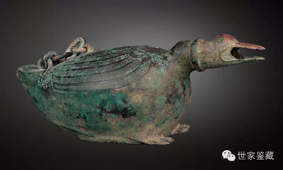 這尊青銅鴨器通體造型爲鴨形,體態豐腴,呈蹲臥狀,曲頸,雙目炯炯有神,似乎正嘎嘎長鳴,意欲啄食,可愛動人!背鑄一圓口,有蓋,蓋上有套環與尊體連接,而以中空的鴨身爲尊體,底作矮圈足,前以兩爪著地,亦可起支撐作品。尤其背上翅膀及羽毛也刻畫的一絲不苟,工藝之精令人稱奇!此尊一經面世定會讓衆方家激動不已……商周時期的青銅禮器,均給人以莊重、威嚴和神秘之感,而這件鴨形尊卻一反常態,寫實而又親切,給戰國青銅文化增添了濃濃的藝術氣息。這件鴨形尊突破奴隸主那種尊卑等級觀念,以極具浪漫主義色彩的構思,在古代青銅藝術品中可謂鳳毛麟角,目前僅見于中國國家博物館、鎮江博物館和黃骅市博物館中,是這一時期不可多得的藝術精品,堪稱國寶級文物。鴨古稱鹜,鹜即野鴨。那什麽時候野鴨被馴化成家鴨呢?通過商墓中已有銅鴨、玉鴨和石鴨出土,可以推測商代鴨已經是人們喜愛的一種動物。而這類鴨形尊的出現,更爲研究古代農業曆史提供寶貴的實物資料。