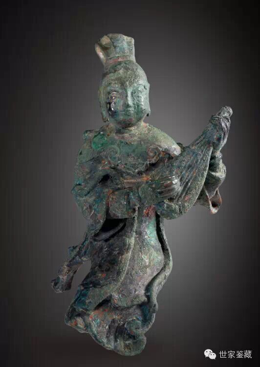 樂舞仕女發挽高髻,雙目微合,面容安詳,身披霓裳,手執琵琶,翩翩起舞,體態輕盈,婀娜多姿,栩栩如生,高貴典雅,在曼妙和婉轉之中,彈琵琶的仕女且歌且舞,身姿曼妙,飄逸輕柔,如入物我兩忘之境,澄明一片,頗有飛天之韻,正所謂“飛行雲中,神化輕舉,以爲天仙,亦雲飛仙”,可謂渾然天成。整體造型體態文靜,層次分明,鑄造傳神,人物肌圓骨潤,呈現出柔和的曲線,極富美感。