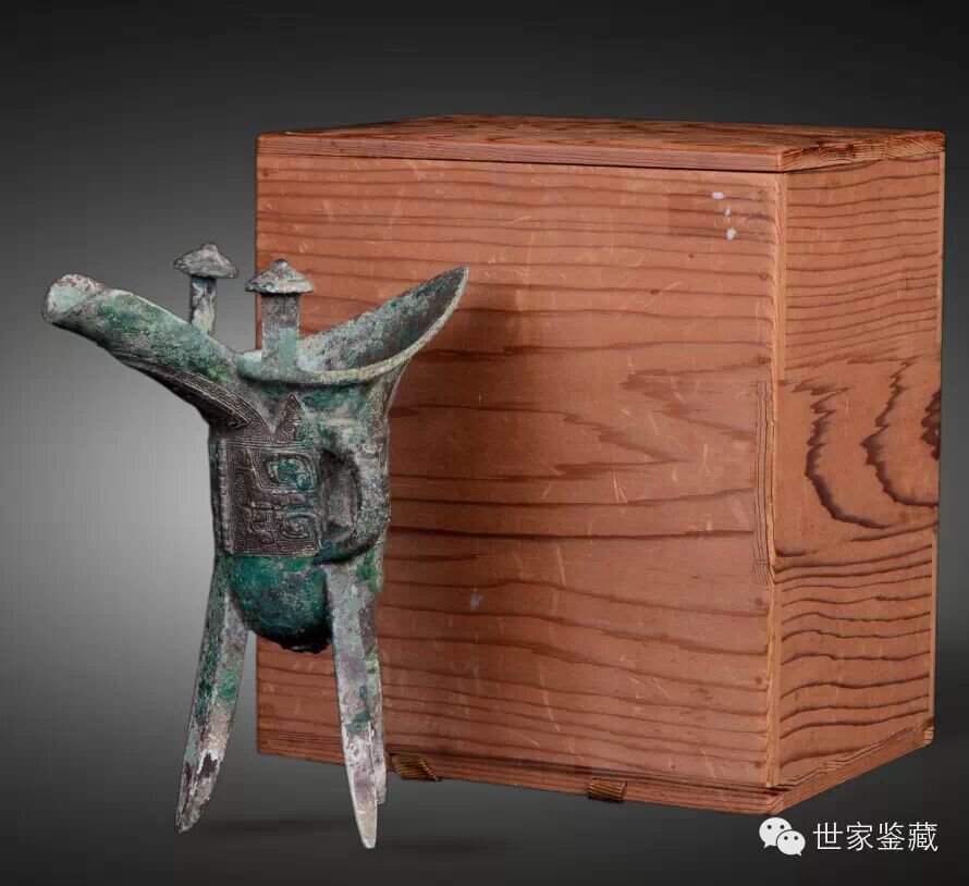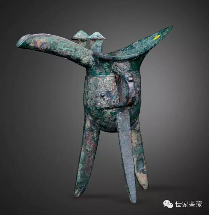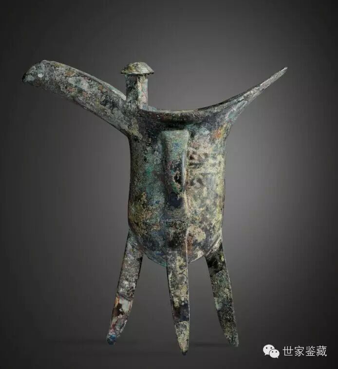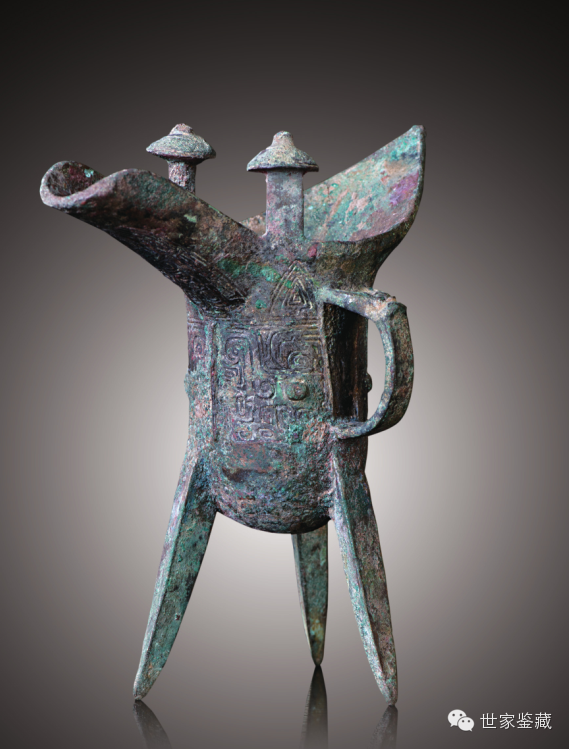 此爵杯長流尖尾,雙柱位于口沿兩側近流一端,柱上帽爲圓菌形,卵形深腹,三棱形錐尖足,鋬飾一獸頭,腹部飾獸面紋,並上下飾有一圈圓圈紋,紋飾制作精美,工藝精湛,且包漿自然,充滿神秘、獰厲之美,保存完好,族徽清晰,器型較大,爲西周時期的精品之作,不可多得。