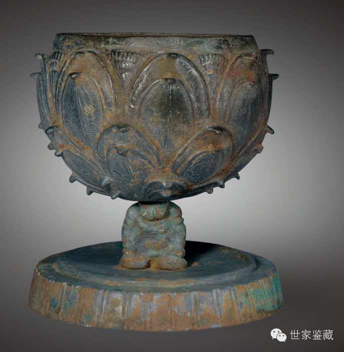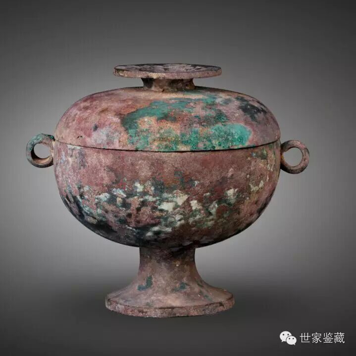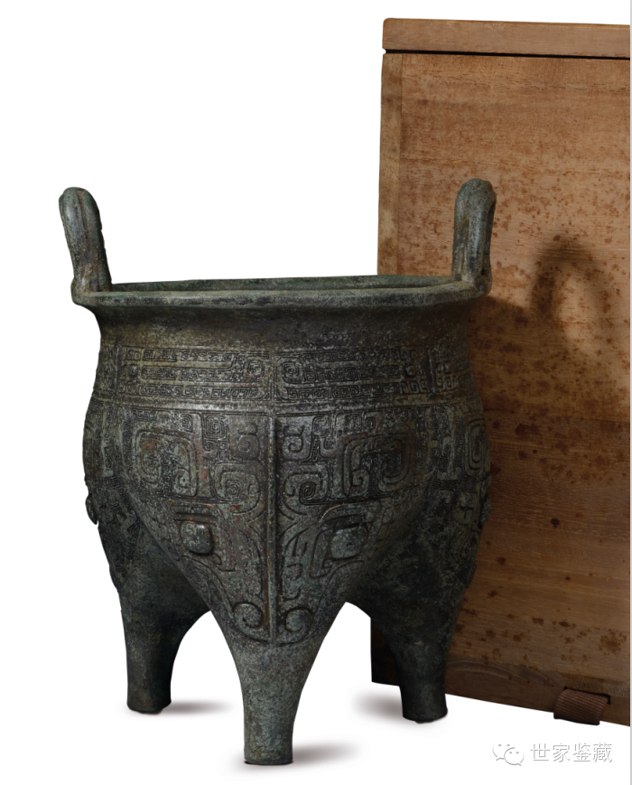 戰國策.東周策:「夫鼎者,非效醯壺醬瓿耳,可懷挾提挈以至齊者。」古代銅製器皿,圓腹、斂口、圈足,用以盛水酒。盛行於商周時期。瓿形狀似尊,圓體,口沿外撇、短頸、廣肩、腹部扁寬、高圈足。頸、腹、足部均飾以雙周凸弦紋,簡潔有力,肩部及腹部飾夔龍紋間以饕餮紋,圈足上有十字形鏤孔。此器紋飾精美流暢,布局疏密得當,層次分明,銹色古樸自然,表現出商代鑄造青銅器技術的成熟。這件銅瓿在體量大小、紋飾精美程度、保存狀況等方面,絲毫不遜色于考古發掘出土和博物館、美術館收藏的同類器物,具有極高的曆史、文化和藝術價值,是流散海外的中國早期青銅器藝術的代表作之一。