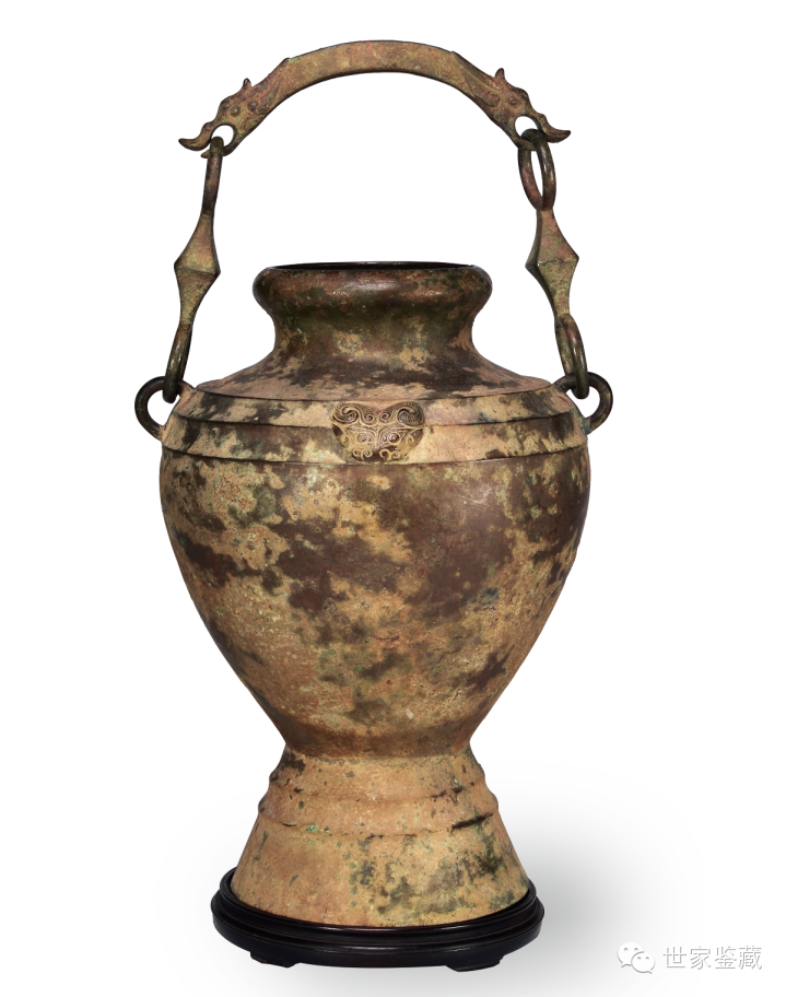 拍品直口,小折沿,短頸,溜肩,鼓腹,平底,方圈足。肩部兩側對稱置獸面鋪首銜環。獸面威嚴,圓晴突出,紋毛細膩。胎壁輕薄,棱角周正。通身飾各種勾連雲紋圖案,圖案花紋是在模鑄好的紋線溝槽中鑲嵌紅銅或金銀、綠松石、填藍漆而構成,以模鑄陽紋爲主體,陰溝填以紅銅、金銀和綠松石襯地,在不同部位變換不同形式。紋線寬而大紋線之上嵌以綠松石,窄細的紋地處嵌以紅銅、金銀爲隔線,但因年代久遠,紅銅、金銀隔線以不複存在。即便如此該方依舊壺雍容華貴,層次分明之余,蘊藉沈厚,爲比較典型的春秋戰國時期的青銅器。