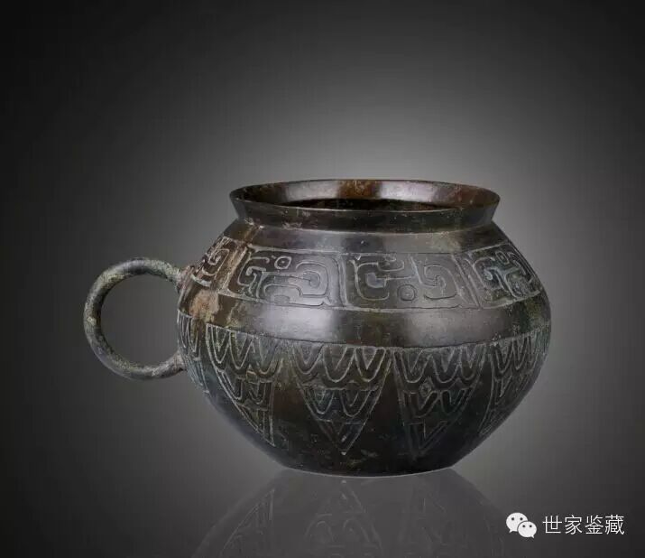 此件拍品為飲酒器,敞口,溜肩,鼓腹,腹下漸收至底,平底。器身有一環形把,肩上飾竊曲紋,腹部飾波紋,兩種紋飾以弦紋做分隔。波紋以倒三角形排列,形成大片花紋,獨具特色。整體器形圓潤精致,值得珍藏。