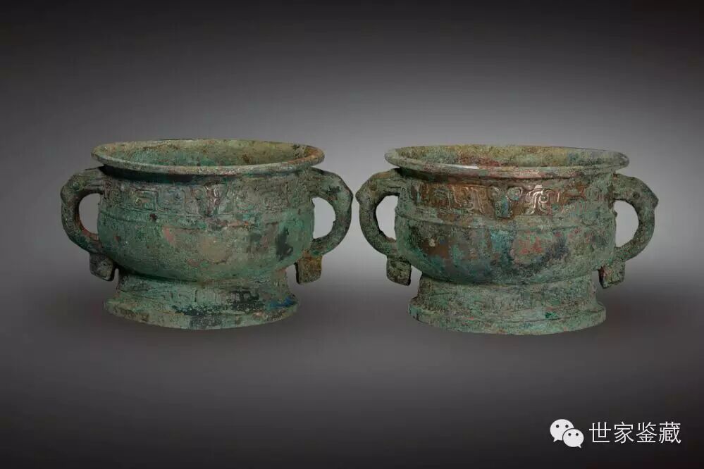青銅簋是一種盛食器,盛放煮熟的黍、稷、稻、梁。商周時期,簋成爲禮器。特別是西周時期,在祭祀、宴飨和隨葬時偶數組和和奇數的列鼎配合使用——周代的禮制規定:天子用九鼎八簋;諸侯用七鼎六簋;大夫用五鼎四簋,士爲三鼎二簋。青銅簋成爲僅次于鼎的王者重器。此對青銅簋,敞口,矮圈足,腹部兩側有雙半環耳,耳首鑄成龍首張口,耳端有小珥下垂。腹部和頸交接處鑄有一周典型的西周回紋地長卷尾鳳鳥紋。器腹部飾一周弦紋,器底近圈足鑄有一圈夔龍紋。整器紋飾尤其以鳳鳥紋最爲典型,鳳鳥紋呈對稱分布,中鑄有凸起獸面紋。此紋飾大約出現于殷商之際,而盛行于周初,商代被稱爲玄鳥的後代,玄鳥即爲殷商圖騰鑄于器物之上,那麽西周之際爲何又如此盛行呢?這可能和當時的太陽神崇拜有關系。遠古時代,人們就認爲有一種太陽神鳥,可以通天,從以下器物紋飾中可見一斑:河姆渡文化遺址中,象牙雕片及骨匕柄上的雙鳳朝陽紋,其中鳳鳥即爲太陽神鳥,是一種太陽神崇拜的象征。而此鳳鳥紋,也是兩兩相對,雖然中間變成獸面紋,可能是商人用來祭祀太陽神之用。故而推測,這些鳳鳥紋很有可能也是太陽神鳥,爲太陽崇拜的象征。這對青銅簋紋飾華麗,但不繁缛,造型威嚴,莊重而又典雅大方,通身布滿翠綠銅鏽,堪稱西周銅器中之精品。它們的出現對于研究古代禮制及宗教信仰都提供了重要的物證。