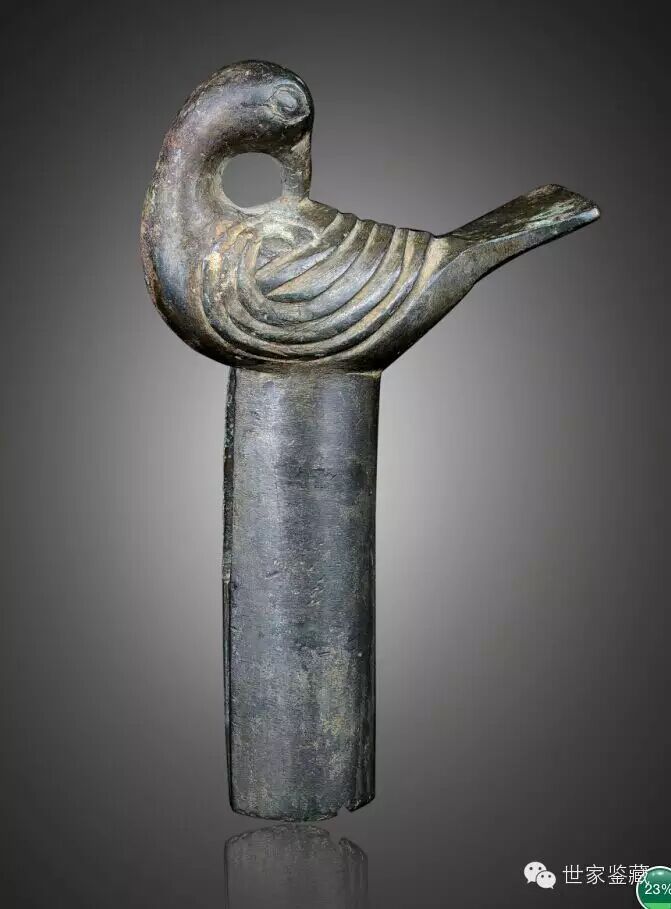 此件鳥形杖首,質地爲青銅,包漿古樸厚重。古代匠師們通過形象思維及理念創作出形態逼真的鳥形杖首,短喙,昂首,圓眼炯炯有神,高冠直立,體型圓潤,羽翼線條簡潔有力,呈臥姿,以其輕盈待飛的姿態吸引觀賞者的視線。至今,此對象正是當時他們以巧奪天工的創造才能追求美的結果,將自然界中鳥獸生動之美實物化,展現精美絕倫的西周青銅藝術。