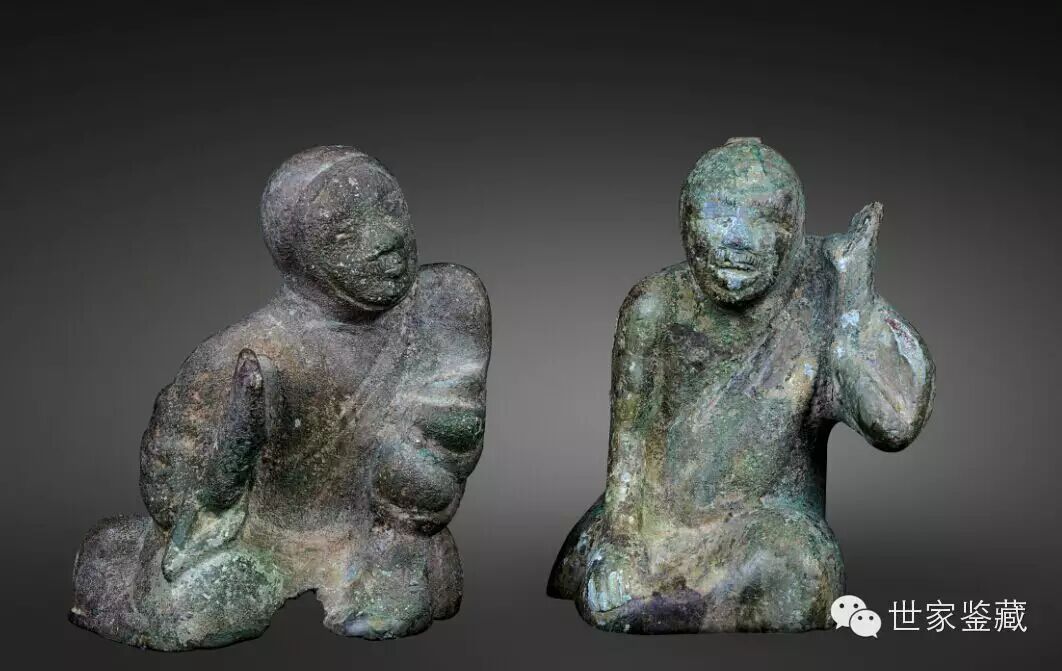 漢代民間盛行說唱表演,表演藝人稱為俳優,他們彈奏樂器,或說書,或歌唱,以調謔、滑稽、諷刺的表演博得主人和觀賞者的笑聲。當時的皇室貴族以及權勢之家都蓄養俳優以為樂。歷史上對於俳優的記載:《漢書.卷五十一.枚乘傳》:「詼笑類俳倡」。《漢書.卷六十八.霍光傳》:「引內昌邑樂人,擊鼓歌吹作俳倡」。《漢書.卷六十八.霍光傳.顏師古.注》:「俳優,諧戲也」。《史記.卷一一二.主父偃傳》:「金石絲竹之聲不絕耳,帷帳之私,俳優侏儒之笑不乏於前,而天下無宿憂」。丞相田蚡「愛倡優巧匠之屬」。桓寬《鹽鐵論·散不足》雲:「富者祈名嶽、望山川。椎牛擊鼓,戲倡儛像」。《說文解字》:「俳,戲也。」段玉裁.注:「以其戲言之謂之俳,以其音樂言之謂之倡,亦謂之優,其實一物也」。《史記.卷八十七.李斯傳》:「是時二世在甘泉,方作觳抵優俳之觀」……等不勝枚舉。此對說唱人俑,青銅質,皆呈坐姿,一敲擊樂器,另一說學逗唱、眉開眼笑,兩人默契互動,神情詼諧自然,觀者似乎能感受到台下觀眾笑聲。此對人俑充分的反映出當時市井小民的生活趣味。